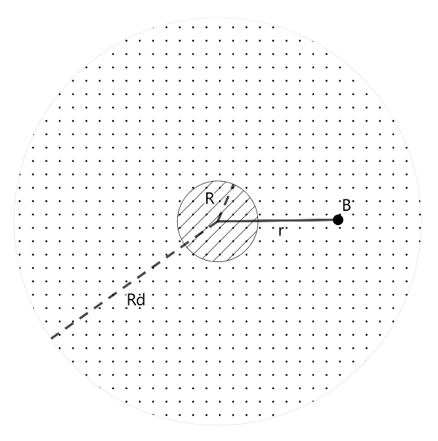这个时候需要考虑暗物质与暗物质之间的重力,这个斥力的远程效应已经比较明显,不可忽略.约定中心天体的半径$R$,暗物质晕半径$R_\mathrm{d}$,中心天体质量为$M_\mathrm{m}$,暗物质晕总质量为$M_\mathrm{d}$,$M_\mathrm{d}$与$M_\mathrm{m}$的比值为$k_\mathrm{d}$.暗物质晕中任意一点B,B与中心天体距离$r$,B的质量$m_\mathrm{d}$,B受到中心天体的重力$F_\mathrm{md}$,受到B暗物质晕的重力$F_\mathrm{dd}$,二者的合力$F_\mathrm{d}$,B与球面的距离$h$,B的密度$\rho$,B的重力加速度$g$,B点暗物质晕的压强是$p$.为了简化分析,假设中心天体内存在暗物质,并且密度与暗物质晕中的暗物质密度相同.