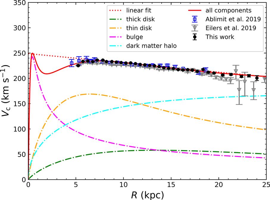 中国科学院大学黄样博士等人所在的研究团队在2023年3月发表一篇论文[29],论文中绘制了距离银河系中心1.6万光年至8.1万光年范围内的银河系旋转曲线,成为目前该范围内最精确的银河系旋转曲线.相关的银河系的星系旋转曲线如下图所示