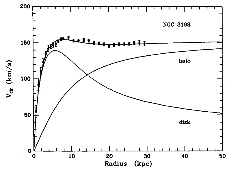 下图是螺旋星系NGC 3198的旋转曲线.图中带有误差线的拟合曲线显示了其外部恒星的实际速度.标有"disk"的线条显示的是预期的旋转曲线,如果星系中唯一的质量是可见恒星的质量.标有"halo"线是观察到的旋转曲线所需的额外暗物质.68"halo"线基于公式$\rho_\mathrm{halo} \left( R \right) ∝ \left(\left( \frac{a}{R_{0}} \right)^{\gamma} + \left( \frac{R}{R_{0}} \right)^{\gamma}\right)^{- 1}$.[31]