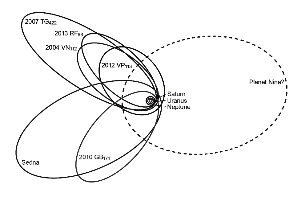 康斯坦丁·巴蒂金和迈克·布朗发现,六颗海王星外天体(Trans-Neptunian object,TNO)的轨道分布得到最佳地模拟重现的条件是加入一个10倍地球质量的行星并具有如下的轨道特征: